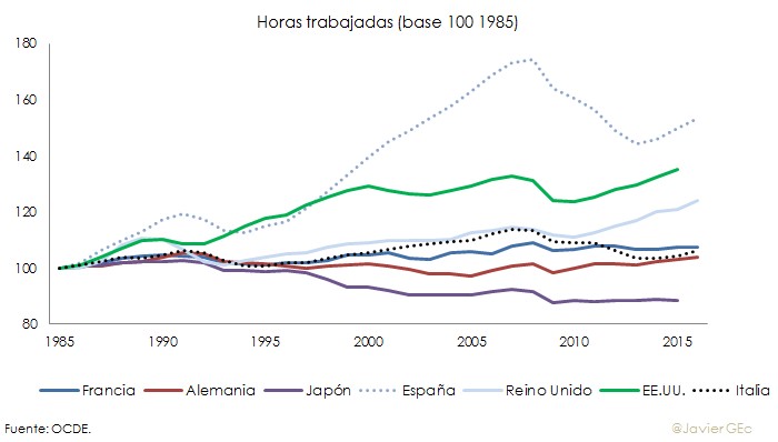 Otro motivo es la baja productividad del factor trabajo, sobre la que incide, además de la baja productividad del capital, factores diversos como una insuficiente educación y el elevado peso de la contratación temporal. El proceso de continua transición entre contratos temporales al desempleo y de nuevo a un contrato temporal tiene como efecto que el nivel de formación en la empresa sea menor que si su permanencia en su puesto de trabajo fuera más prolongada. El hecho de que la temporalidad-desempleo afecte más a los más jóvenes agrava este problema.