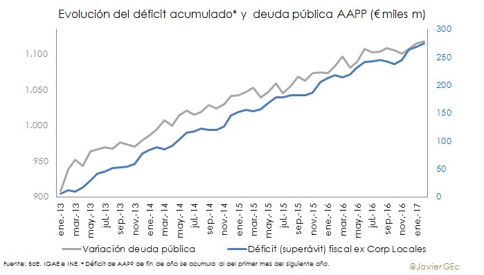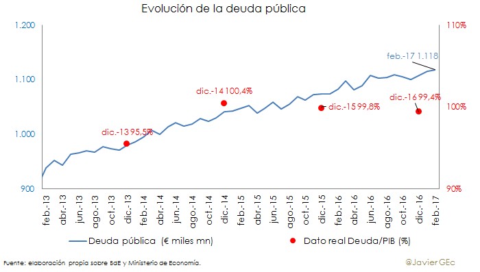 Aunque la ratio deuda sobre PIB se haya estabilizado, la deuda en millones de euros no para de crecer como resultado de los continuos déficits públicos.