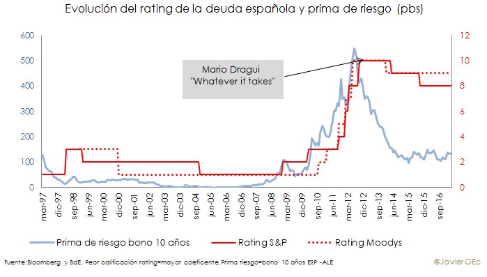 Además, hay que considerar que con el inicio de las medidas de política expansiva del BCE desde 2012, el coste de financiarse no se corresponde con los fundamentales de las cuentas públicas. La subida de los tipos de interés a corto y medio plazo como consecuencia de la retirada de los estímulos monetarios puede generar, igualmente, nuevas tensiones en las cuentas públicas españolas, cuyo impacto podría afectar negativamente al crecimiento económico.