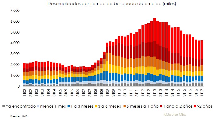 Tras el estallido de la crisis, el paro de larga duración es el que más ha aumentado, reflejando así las dificultades que presentan ciertos colectivos para reincorporarse al mercado laboral, mientras que el número de desempleados con menos de un año en el paro se ha mantenido estable.