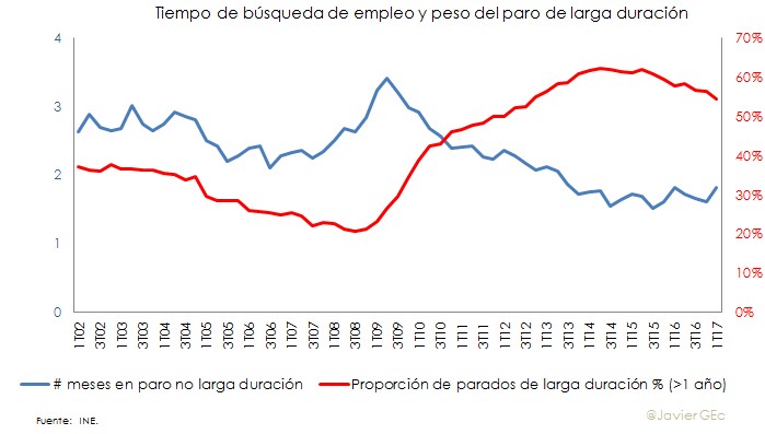 La proporción de personas con más de un año en el paro, muchos de ellos procedentes del sector de la construcción, ha crecido con fuerza desde 2009 y apenas desciende ligeramente en los dos últimos años. Por el contrario, los desempleados que no caen en la trampa del desempleo crónico desde 2009 encuentran un empleo con una mayor facilidad -desde algo más de tres meses en 2009 a algo menos de dos en la actualidad-.