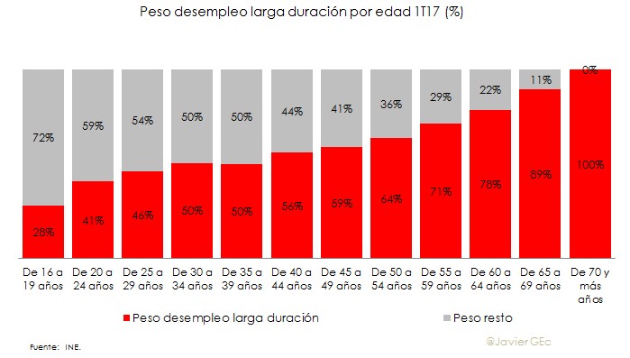 Además, si bien la proporción de parados de larga duración se reduce desde 2015, es probable que esta caída no obedezca tanto a que haya encontrado trabajo como a que una parte de este colectivo se jubila y pasa a ser población inactiva. No en vano, mientras la mitad de los parados con entre 30 y 39 años lo son de larga duración, cuatro de cinco con más de 60 años están en el paro desde hace más de un año.