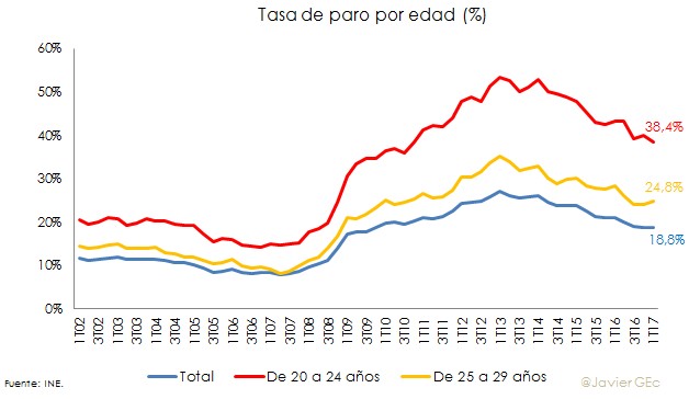 Por otro lado, si el problema del paro crónico incide especialmente entre la población de mayor edad, el drama entre los más jóvenes es el elevado desempleo juvenil, con tasas próximas al 40%.