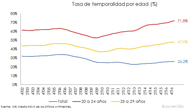 En este caso, el problema no es el paro de larga duración como la precariedad, es decir, el tránsito continuo entre el desempleo y el trabajo temporal. Así, mientras que uno de cada cinco asalariados tiene un contrato temporal, cerca de la mitad de los trabajadores de entre 25 a 29 años y casi tres de cada cuatro de entre 20 y 24 años enlazan un contrato temporal con otro en el mejor de los casos, ya que en el peor pasan a la cola del paro.