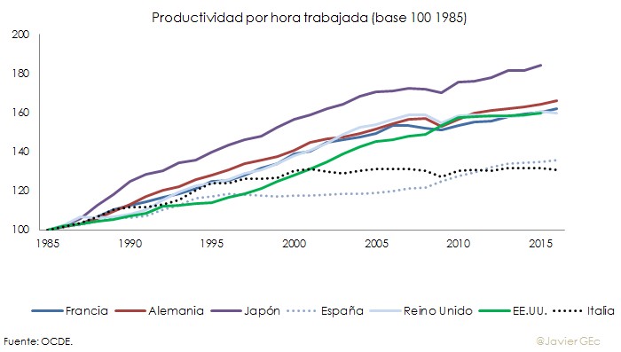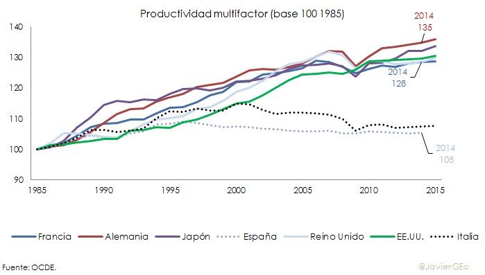 El segundo gran lastre es la baja productividad de la economía española. Y prueba de ello es que en los últimos 30 años ha crecido apenas un 5%, en comparación con el 35% registrado en Alemania o el 28% en Francia. Entre las principales economías europeas, la baja productividad multifactor, es decir, del capital y del factor trabajo, tan sólo es similar a la italiana.