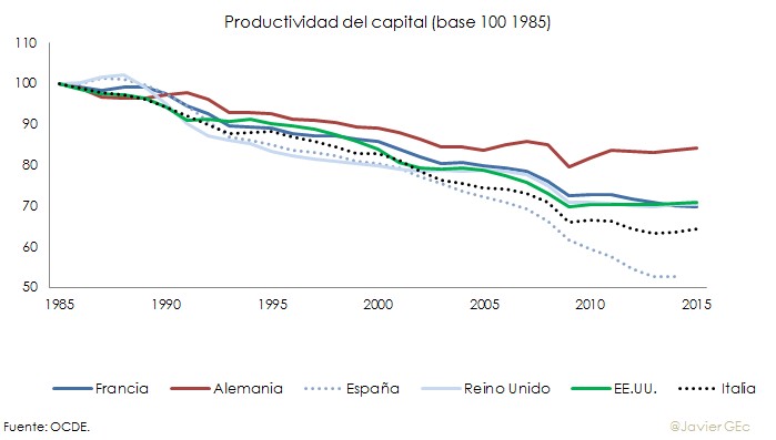 Ahora bien, ¿por qué es tan baja la productividad española? Por una parte, el capital utilizado genera una menor producción debido, probablemente, al tradicional uso intensivo de mano de obra por parte de la construcción. El último dato disponible, de 2014, indica cierta estabilización en la caída sobre 2013. Dado que la inversión en la actual fase de recuperación se está orientando más a bienes de equipo o intangibles y menos al ladrillo, este dato podría anticipar una evolución menos negativa en el futuro.