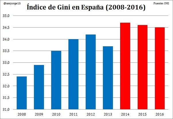 Este particular argumento se sustenta sobre los datos del índice de Gini que ofrece la encuesta de condiciones de vida del INE cada año. En el siguiente gráfico se ve que, mientras que este indicador aumentó en 1,3 puntos entre 2008 y 2013, en tan solo un año (2013-2014) creció en un punto, casi tanto como los 5 previos. Así las cosas, es razonable pensar que la llegada de la recuperación en 2014 supuso un fuerte aumento de la desigualdad, pese a que ésta se haya reducido dos décimas en los dos ejercicios posteriores.