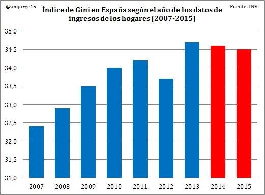 Una vez aclarado esto, se puede rehacer el gráfico anterior, teniendo en cuenta que el índice de Gini de cada encuesta corresponde al año previo, con lo que tenemos datos sobre la desigualdad de renta en España desde 2007 hasta 2015. En este caso, si nos fijamos en los dos años en rojo, 2014 y 2015, vemos que la desigualdad no ha aumentado durante este nuevo periodo de expansión económica, sino que se ha reducido levemente en dos décimas.