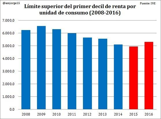 Además, si observamos cómo ha evolucionado la renta del 10% de la población con menos recursos comprobamos que, si bien en 2014 perdieron renta respecto a 2013 (-3,15%), fue una pérdida relativa muy inferior a la que experimentaron en 2013 (-8,4%). De hecho, es en 2015 cuando, por primera vez desde el comienzo de la crisis, la renta de este 10% más pobre ha subido, tal y como muestra la última encuesta del INE, empleando datos de 2015.