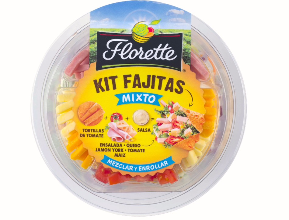 El Kit Fajitas Mixto de Florette contiene tortillas de tomate, base de ensalada, sticks de jamón, sticks de queso, maíz, tomate y salsa blanca que aporta jugosidad.