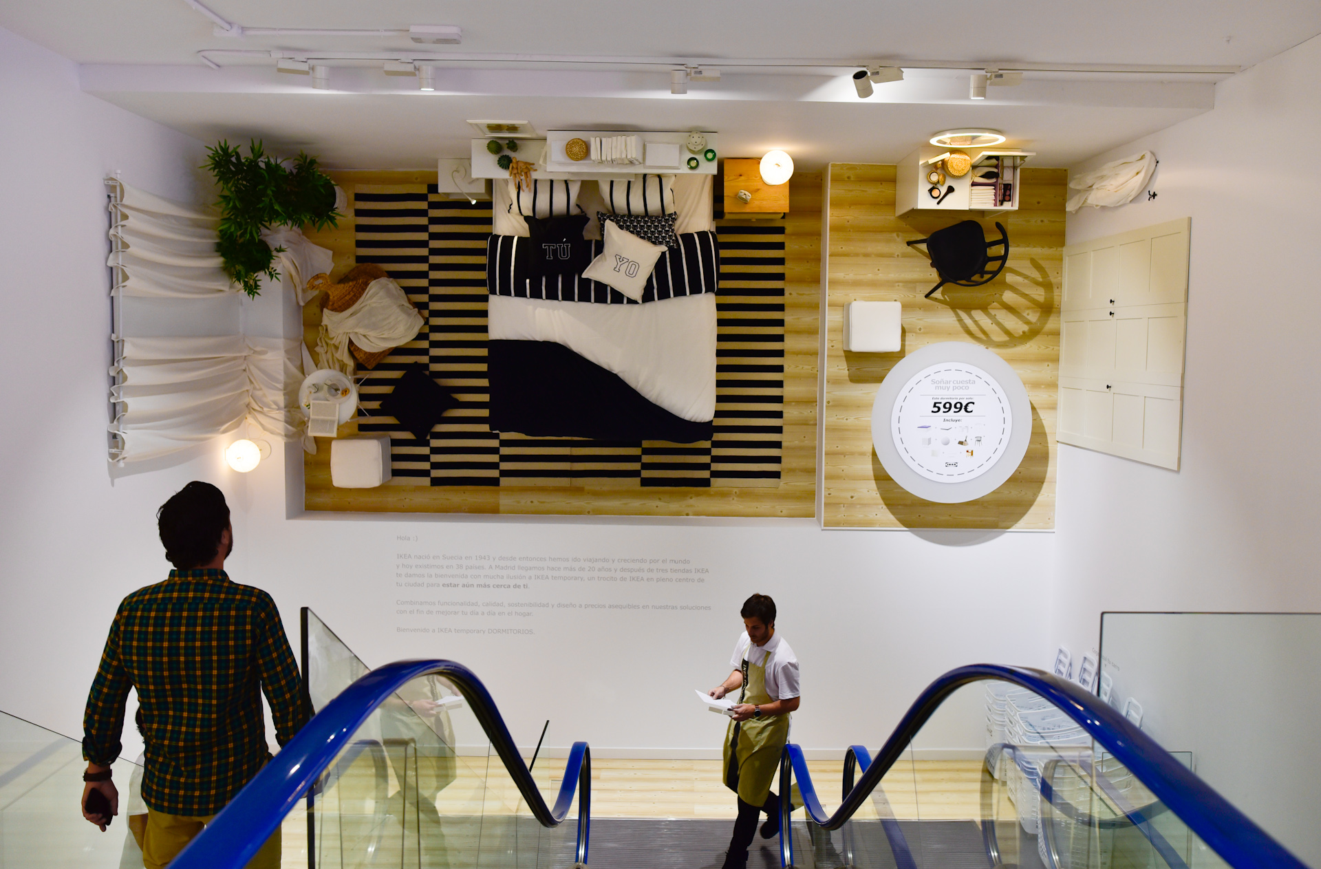 Uno de los rincones más curiosos de la tienda Ikea de Serrano es la zona de entre plantas. Se ha colocado sobre la pared un dormitorio completo creando una visión diferente de la tienda y aprovechando el espacio.