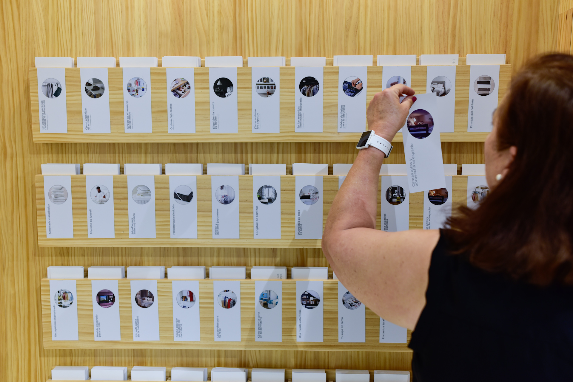 Una mujer lee algunas de las sugerencias de decoración que ofrece Ikea mediante unas tarjetas.