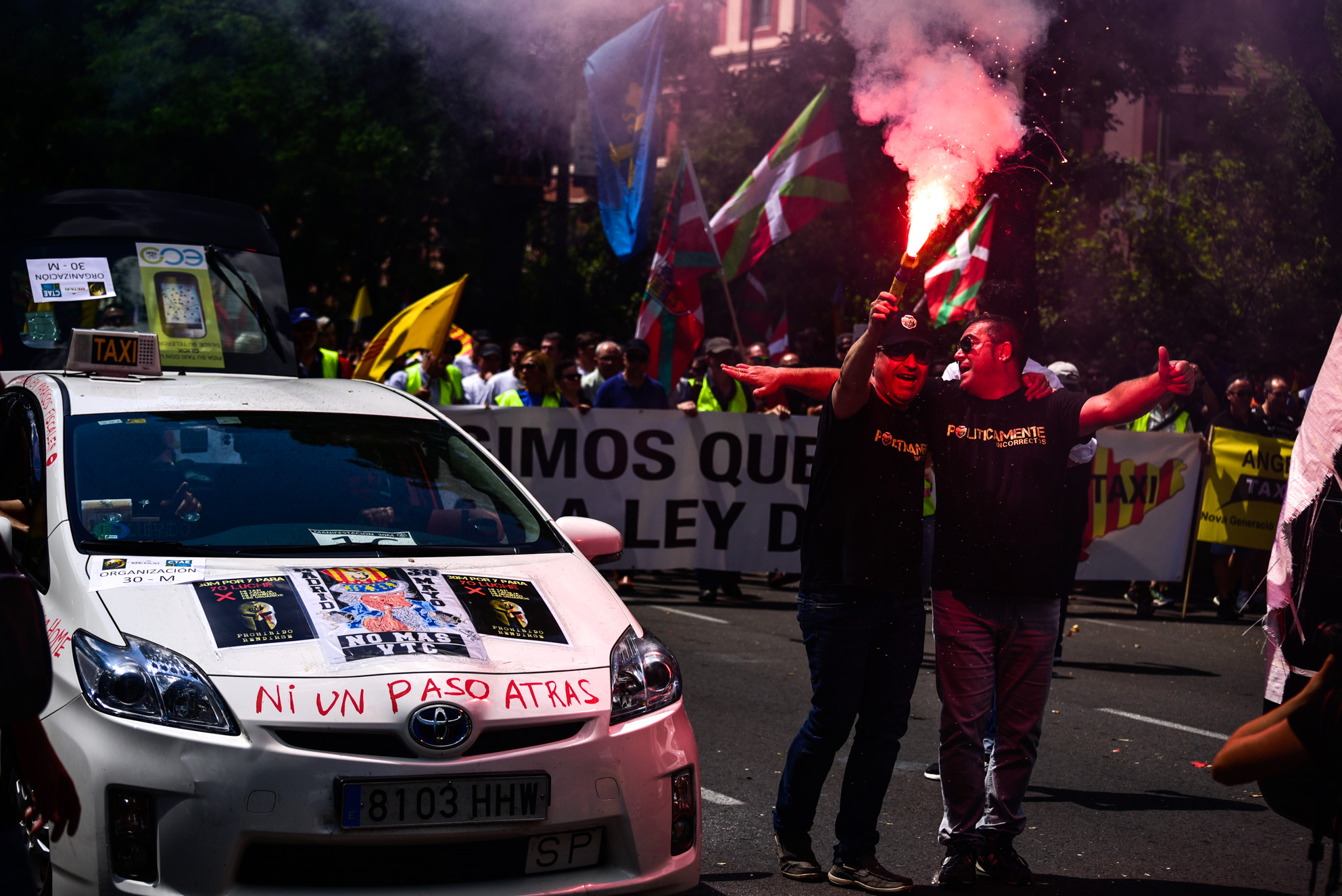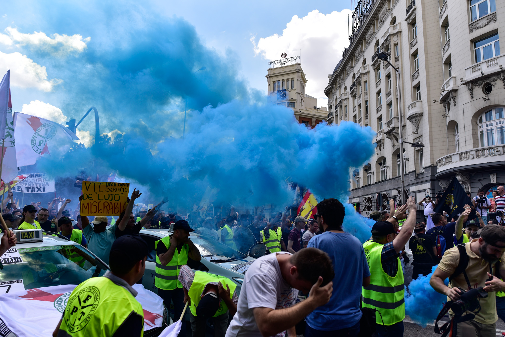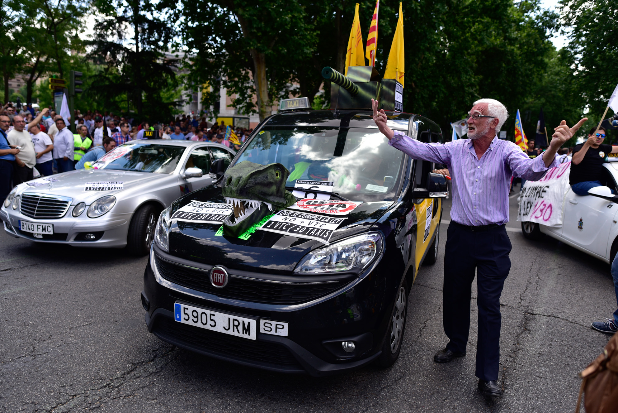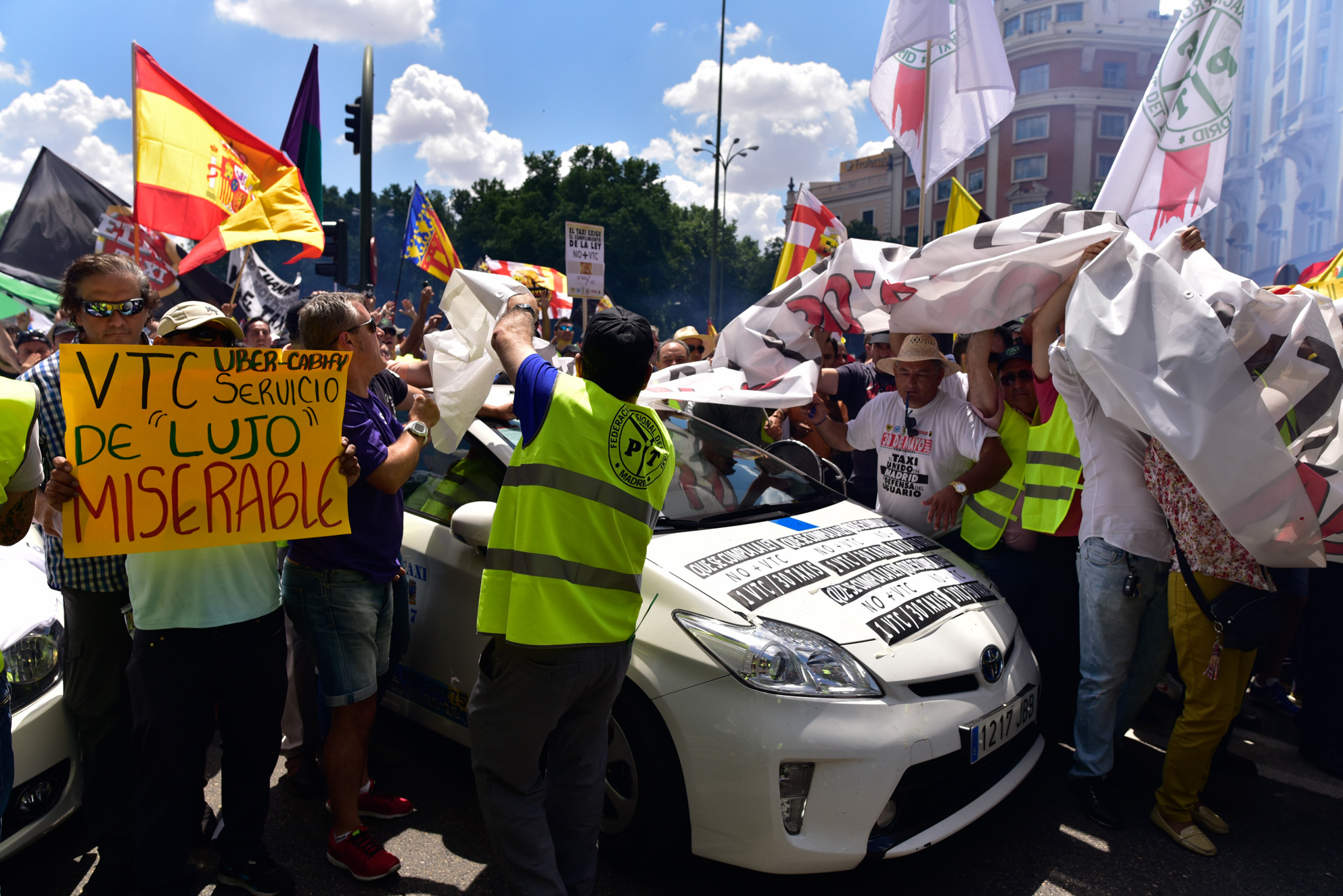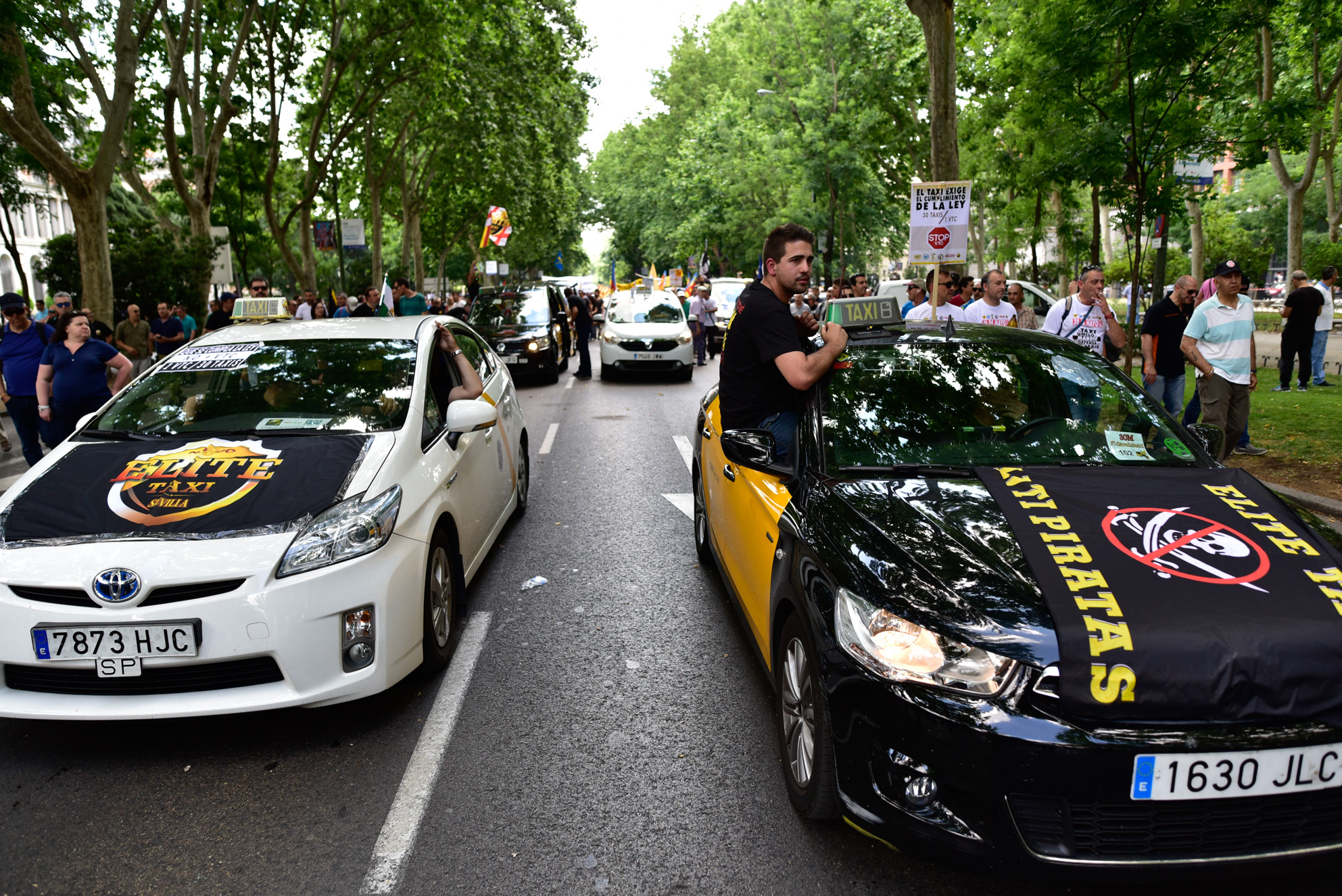 Miles de taxistas se manifiestan en el centro de Madrid para exigir al Gobierno medidas urgentes contra empresas como Uber y Cabify.