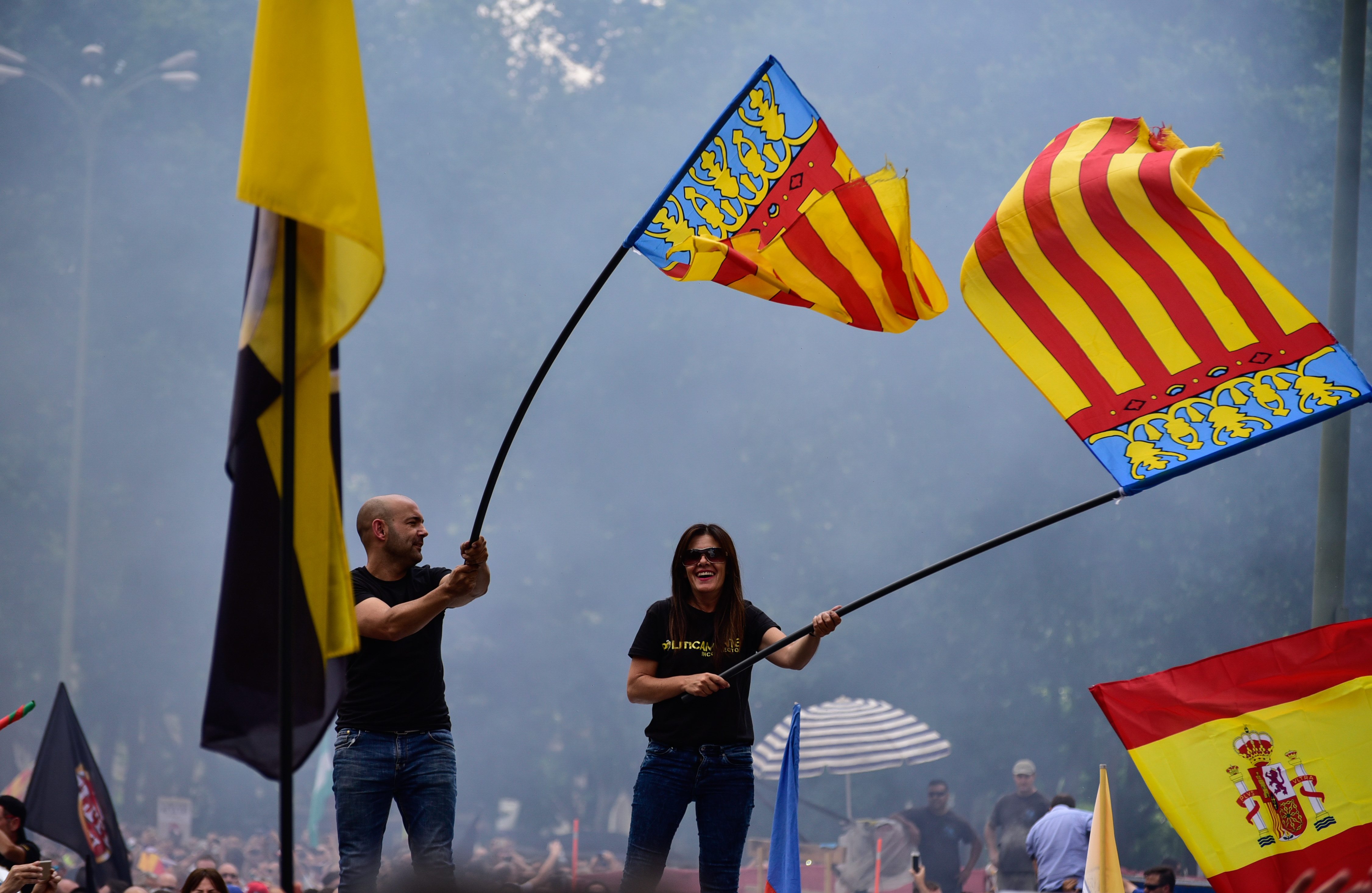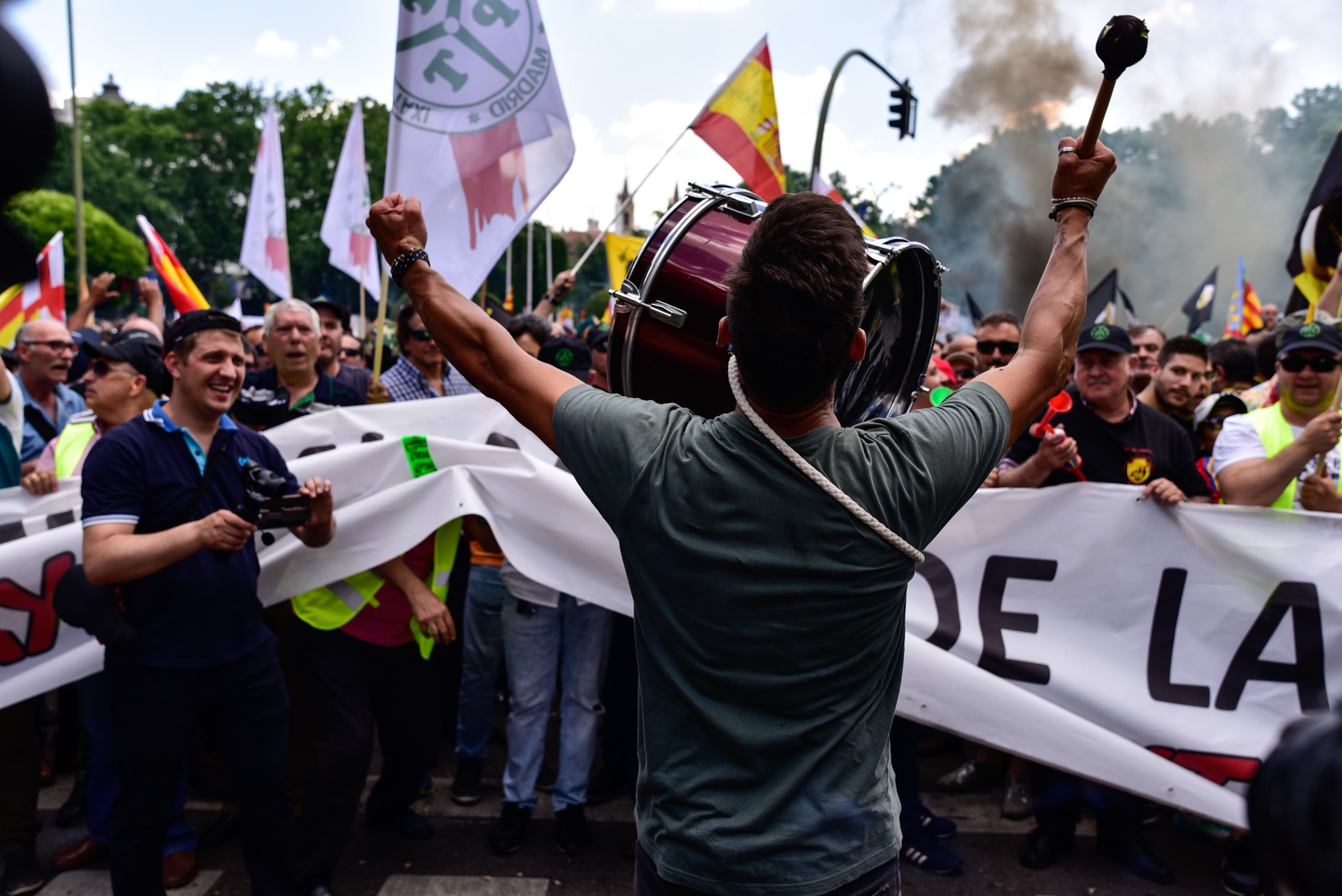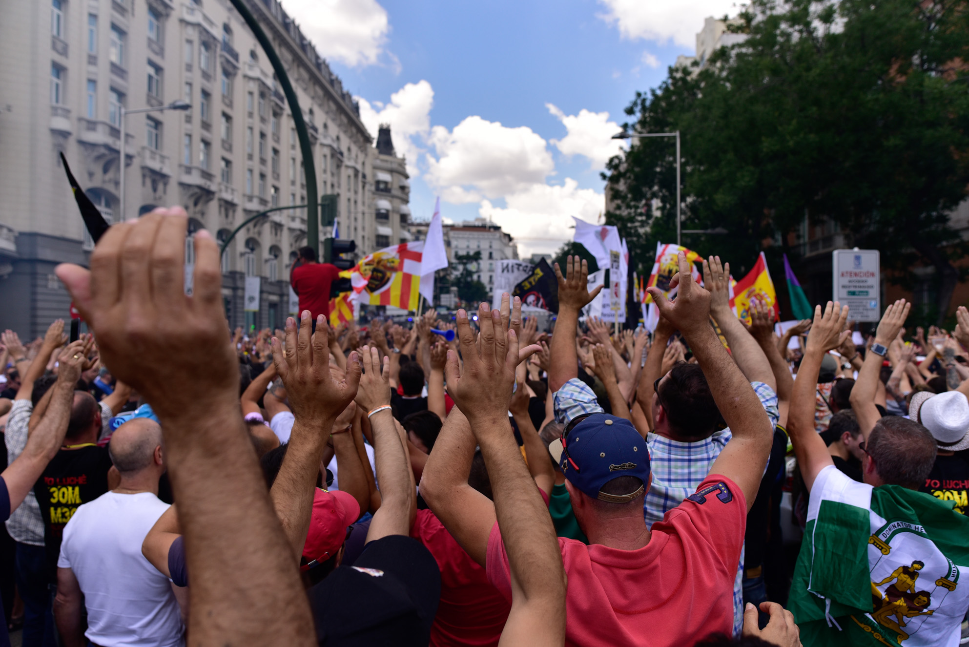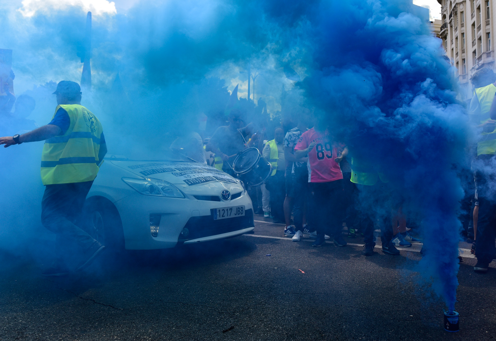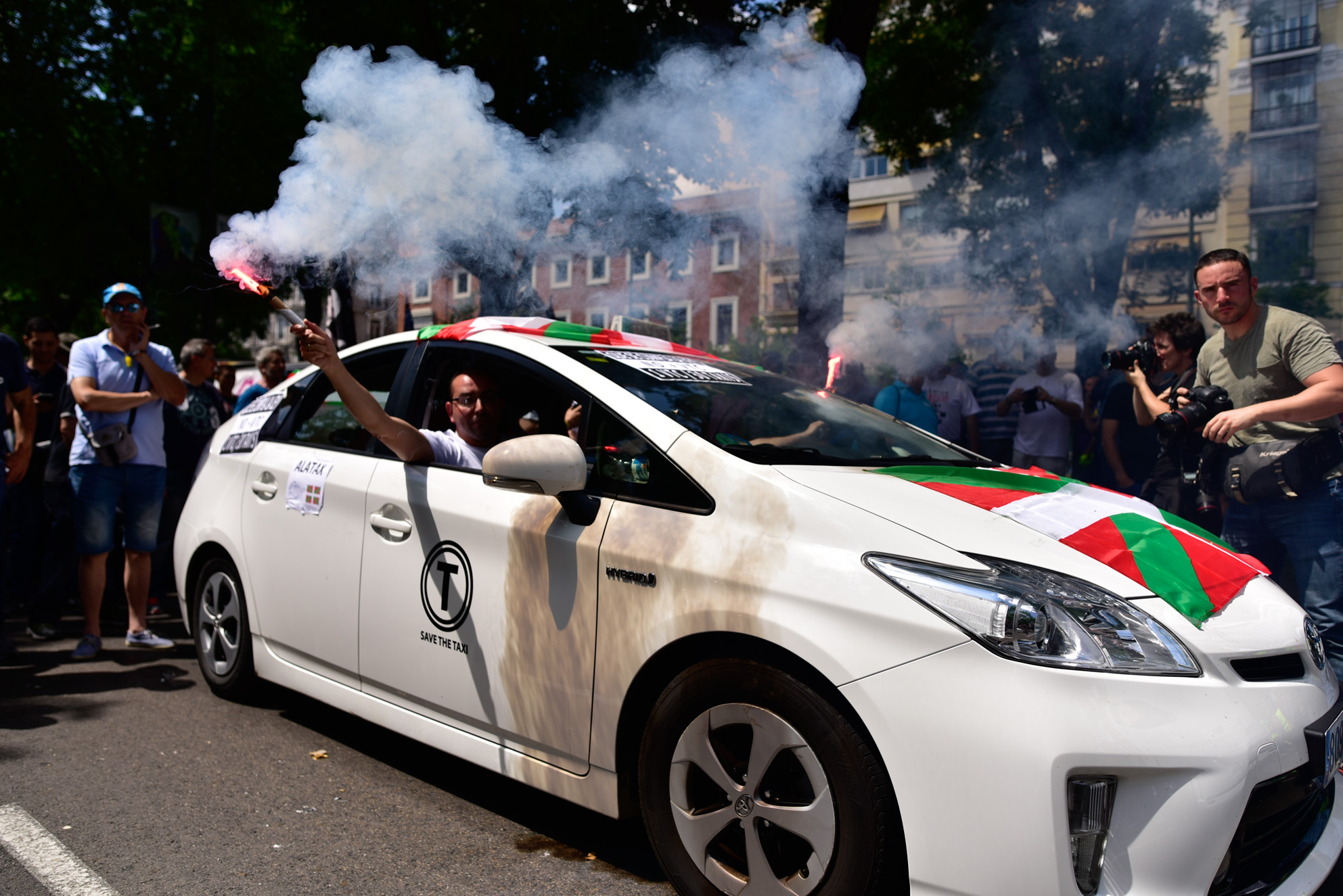 Miles de taxistas se manifiestan en el centro de Madrid para exigir al Gobierno medidas urgentes contra empresas como Uber y Cabify.