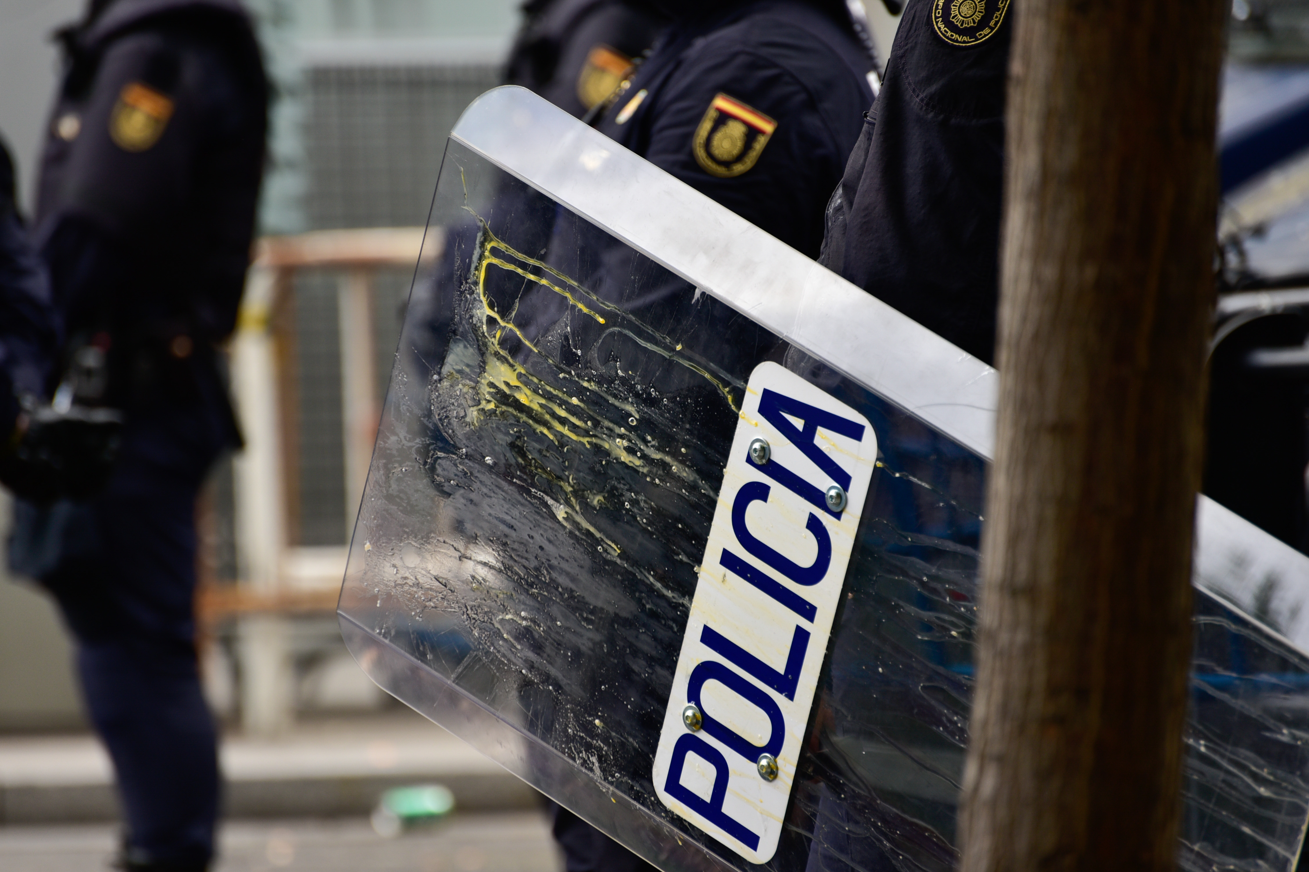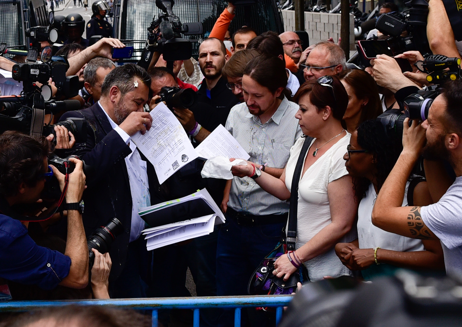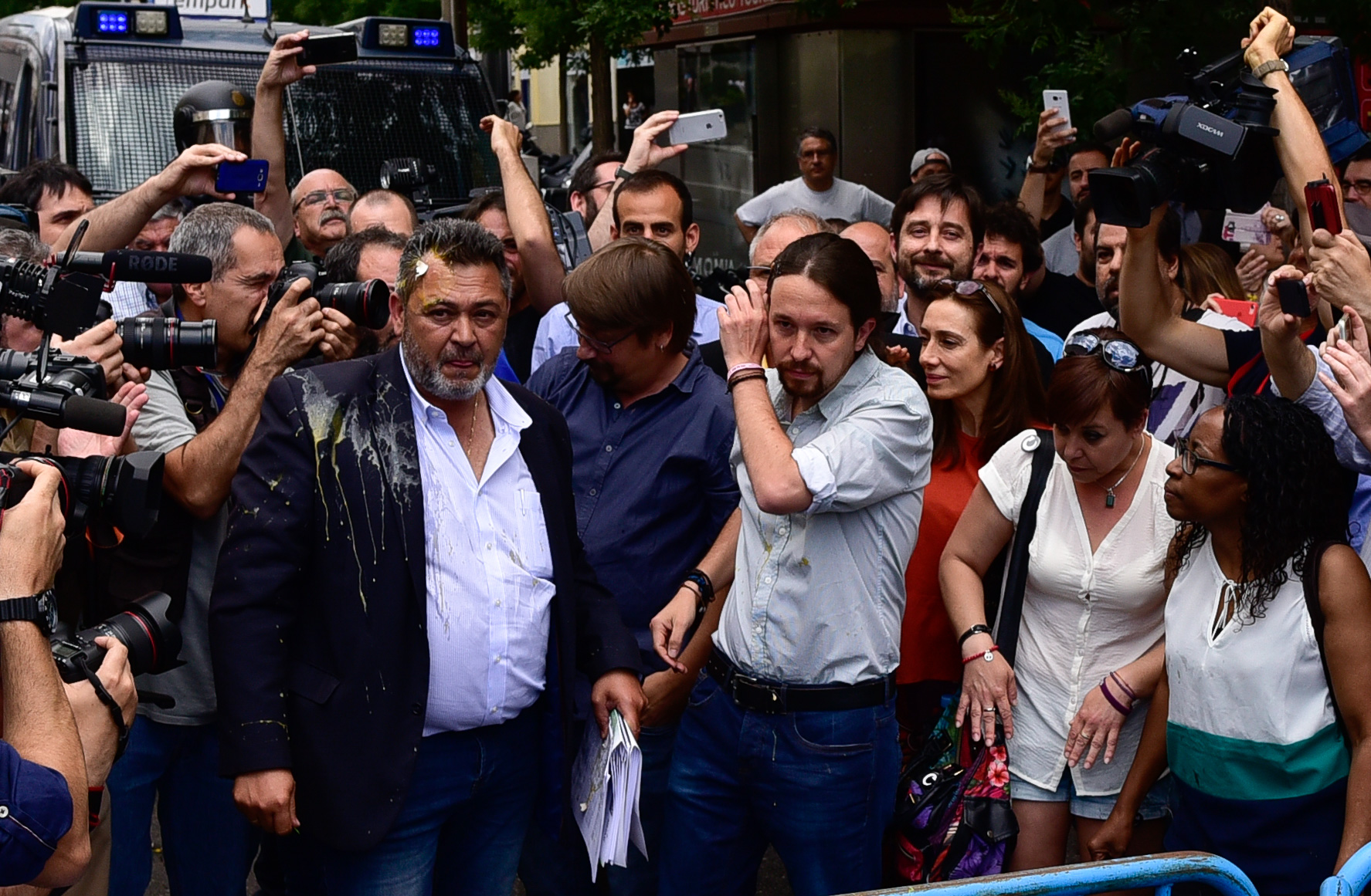 El presidente de la Confederación de Taxistas Autónomos de España, Julio Sanz fue alcanzado por un huevo, que salpicó también al líder de Podemos, Pablo Iglesias.