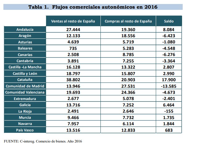 Cataluña fue en 2016 la autonomía más beneficiada por el comercio interregional dentro de España, con un superávit comercial de 17.900 millones de euros, según el último informe de Convivencia Cívica Catalana.