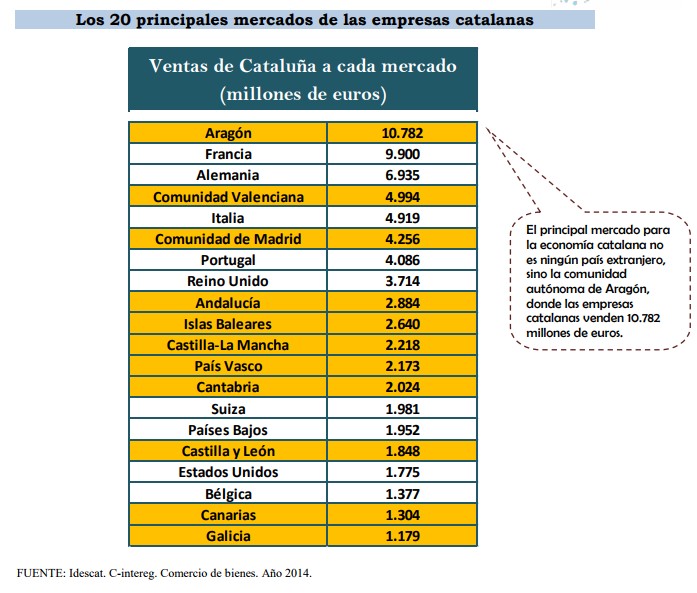 Los datos ponen de relieve la importancia del resto de España para la economía catalana. De los 20 principales mercados de las empresas catalanas, 11 son comunidades autónomas españolas. De hecho, el principal mercado para la economía catalana no es ningún país extranjero, sino la comunidad autónoma de Aragón, donde sus empresas venden 10.782 millones de euros.