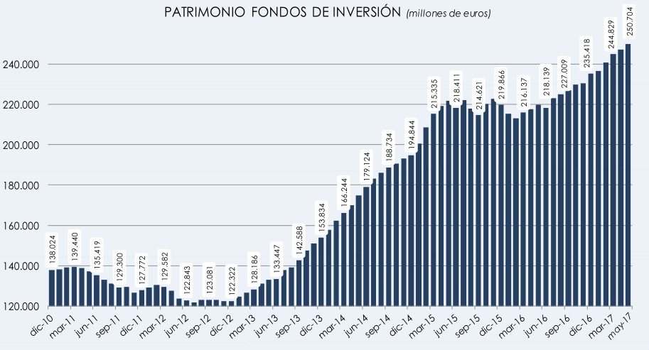 Estos datos corroboran la tendencia observada hasta el momento. Las estadísticas reflejan un crecimiento exponencial en los últimos cinco años. El volumen de activos de los fondos de inversión mobiliaria, a finales de mayo de 2017 se ha situado en 250.704 millones de euros, lo que supone un incremento de 3.440 millones respecto al mes anterior (1,4% de aumento respecto a abril).