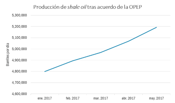 Los países de la OPEP, y algunos países no pertenecientes a la OPEP como Rusia, acordaron a finales de noviembre de 2016 reducir la producción de petróleo en 1,3 millones de barriles diarios (b/d), de 33,8 millones de b/d a 32,5 millones de b/d. Los precios del petróleo pasaron de $45/barril a más de $50/barril. La producción marginal de shale oil se tornó rentable. Así es como los productores estadounidenses de shale oil reaccionaron ante el recorte de la oferta de la OPEP: