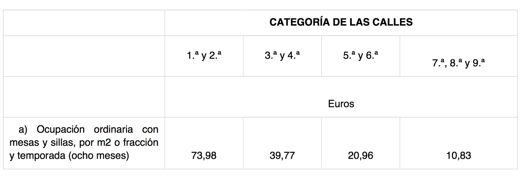 ¿Cómo funciona la tasa? Como explica Redondo, "la tasa por utilización de suelo público está determinada en gran medida por el índice fiscal de calles, condicionado a su vez por el valor catastral". Así, las categorías 1 y 2 soportan un gravamen de 74 euros por metro cuadrado de terraza, mientras que las 3 y 4 se quedan en 40 euros, las 5 y 6 en 21 euros y las 7, 8 y 9 en 11 euros.