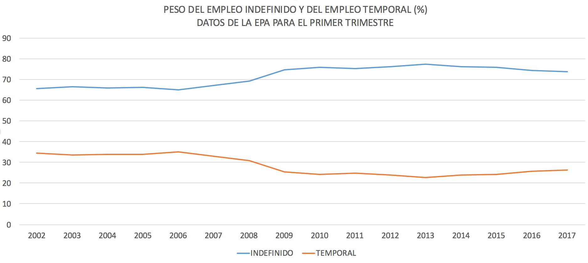 Tras la aprobación de la reforma laboral de 2012, vemos que el peso del empleo indefinido en el sector privado se ha mantenido más o menos constante, incluso en los últimos años con creación de empleo. En 2014 fue del 76%, en 2015 llegó al 75,7%, en 2016 alcanzó el 74,2% y en 2017 se aupó hasta el 73,6%. Vemos que hay una línea descendente, aunque no de forma muy acusada, debido a que poco a poco se está recuperando parte del empleo temporal perdido entre 2008 y 2013. Pero no porque se estén haciendo menos contratos indefinidos.