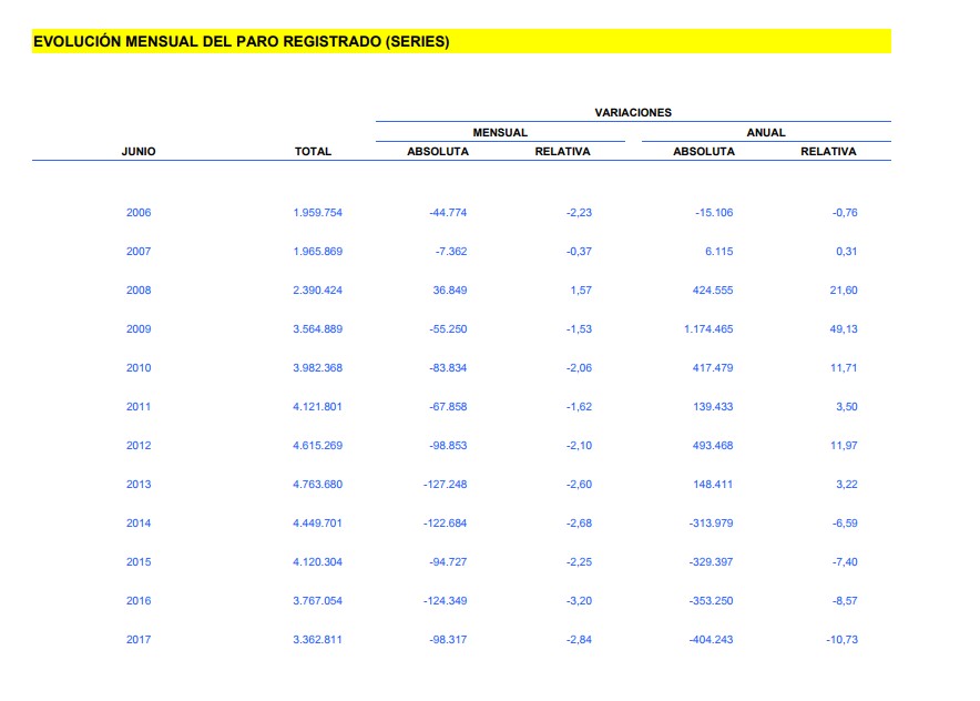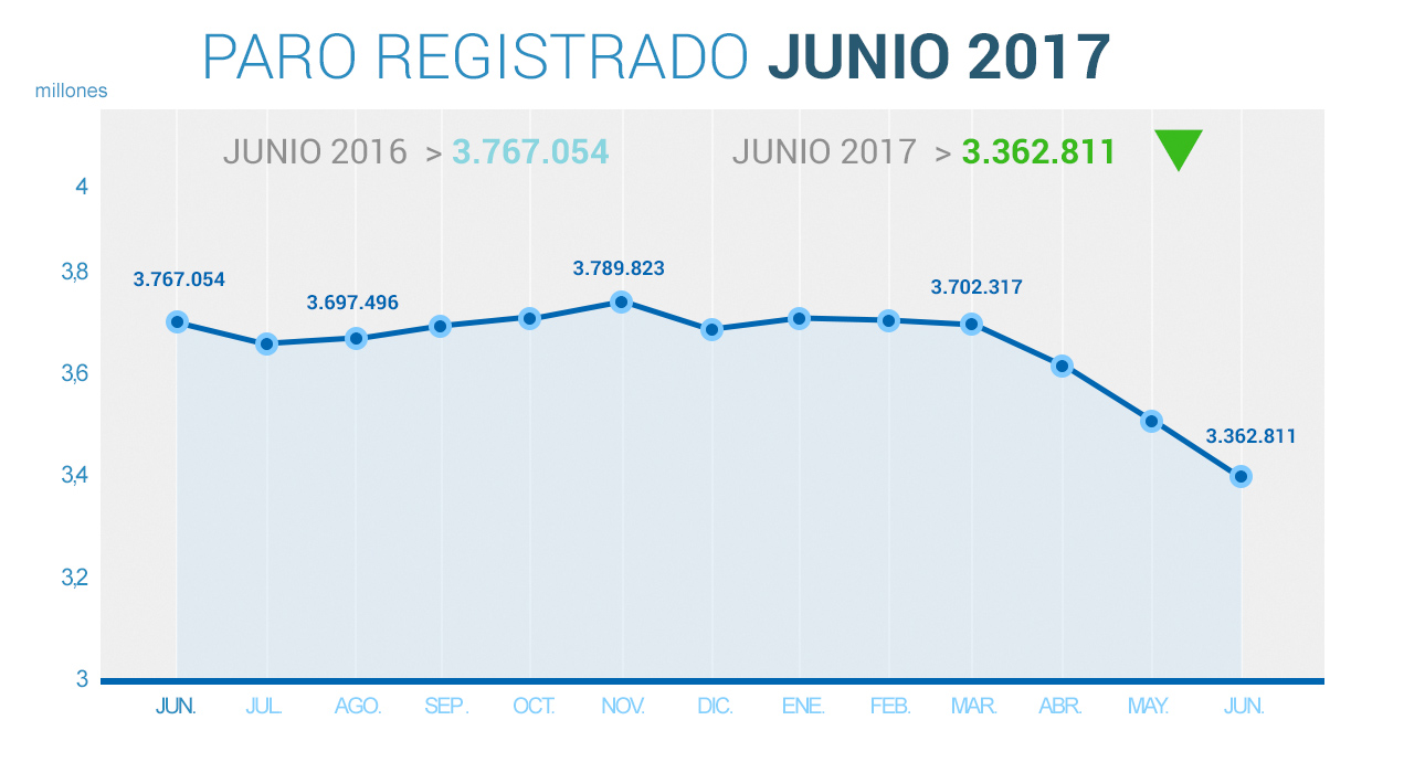 En el sexto mes del año, el número de parados registrados en las oficinas de los Servicios Públicos de Empleo Estatal (SEPE) ha disminuido en 98.317 personas respecto a mayo. Esta caída sitúa la cifra total de desempleados inscritos en 3.362.811 personas, el nivel más bajo desde enero de 2009.