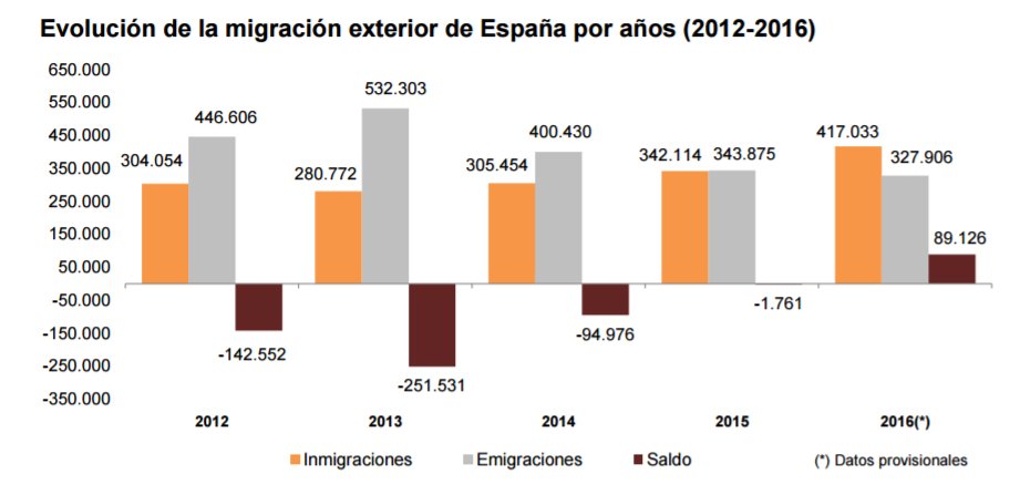 Ahora, la recuperación económica ha permitido que el flujo de inmigrantes vuelva a crecer mientras que el de emigrantes se reduce. En 2016 España logró obtener por primera vez desde el inicio de la crisis un fuerte saldo migratorio positivo de casi 90.000 personas. Es una cifra importante, aunque esté lejos de las más de 300.000 entradas netas del año 2008. Aunque se trata del primer año de la crisis en que esta cifra es positiva, el saldo llevaba mejorando de forma continuada desde 2013 cuando alcanzó su pico más negro con -252.000 personas aproximadamente (es decir, en aquel ejercicio se produjo la salida, en términos netos, de un cuarto de millón de personas).