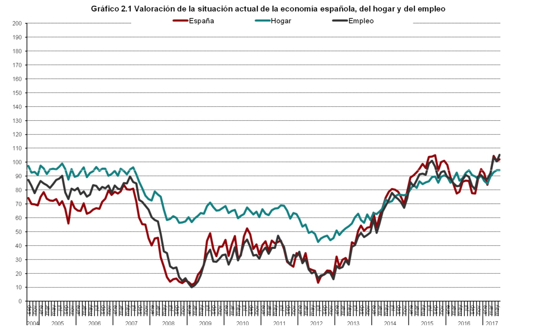 Tanto si hablamos de la situación de la economía española como si nos referimos a los hogares o al empleo, el clima de opinión certifica una mejora progresiva que nos coloca en niveles cercanos a los observados en 2005 y 2006, antes del estallido de la Gran Recesión.