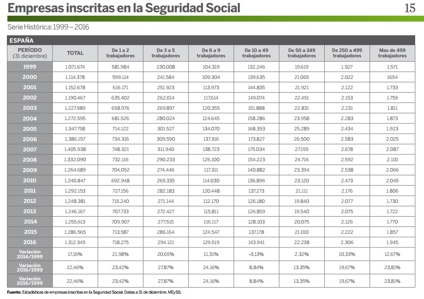 Los dos cuadros de la derecha (click para ampliar) contienen los datos más interesantes del informe. En el primero se muestran cómo se distribuyen las empresas españolas en función de su tamaño. De las 1.312.345 compañías inscritas en la Seguridad Social a 31 de diciembre de 2016, más de un millón tenía menos de 5 trabajadores. Por el contrario, apenas 22.238 tenían de 50 a 250 empleados, otras 2.306 de 250 a 499 empleados y 1.945 más de 500 empleados.