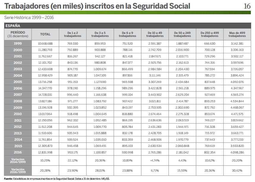 Este martes, el director de Relaciones Laborales de la CEOE, Jordi García Viña, presentaba el informe "Serie histórica 1999-2016. Estudio sobre la evolución de empresas y trabajadores". La patronal utiliza los datos del Ministerio de Empleo para analizar la estructura empresarial española: cuántas empresas tenemos en función de su tamaño, cuántos empleados tienen estas compañías y cómo se distribuyen los trabajadores en los diferentes regímenes de la Seguridad Social.