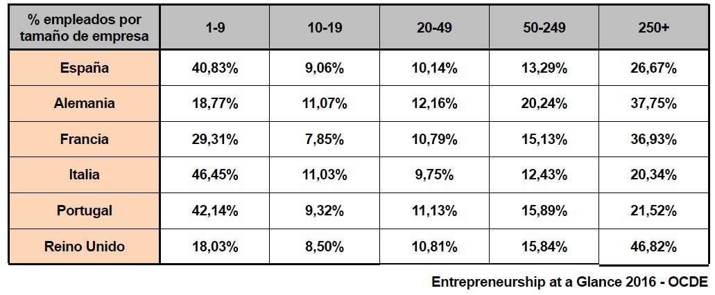 Si además nos fijamos en los países de nuestro entorno, vemos que algo falla. En la siguiente tabla comparamos las cifras de España con las de Alemania, Francia, Italia, Portugal y Reino Unido. Son datos del informe Entrepreneurship at a Glance 2016 de la OCDE (se manejan cifras de 2013, por lo que pueden variar algo respecto a las de la CEOE, que son de 2016). Como puede verse, el porcentaje de trabajadores españoles empleados en pequeñas empresas es muy alto en comparación con nuestros vecinos ricos (y si usáramos los datos de los demás países ricos de la UE los resultados serían parecidos). Sólo Portugal e Italia tienen un porcentaje más elevado de sus trabajadores en micro-empresas y al mismo tiempo tienen menos trabajadores en compañías de tamaño medio-grande y grande.