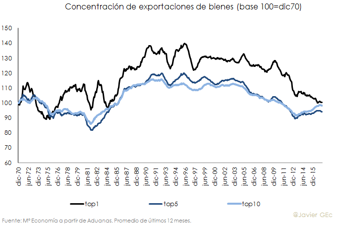 Teniendo en cuenta el grado de diversificación (el porcentaje de concentración en los principales países destinos) podemos ver que la dependencia del primer destino se ha reducido en los últimos veinte años, mientras que la concentración en los cinco y diez principales mercados desciende, si se toma como referencia los últimos veinte años. Si bien, se observa un ligero repunte de la concentración en el top 5 desde 2011.
