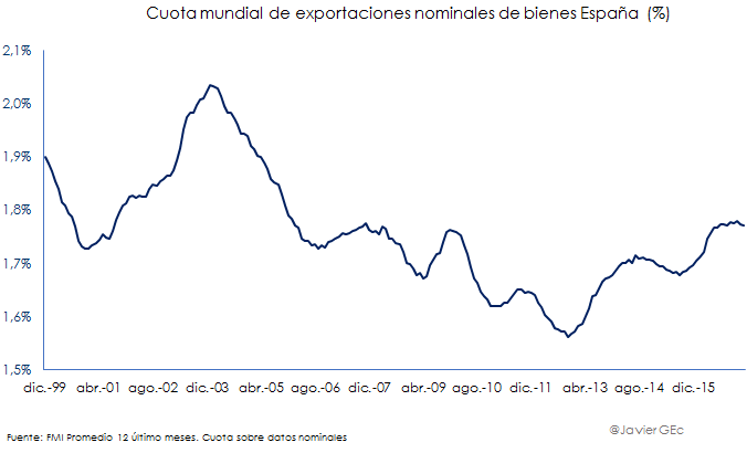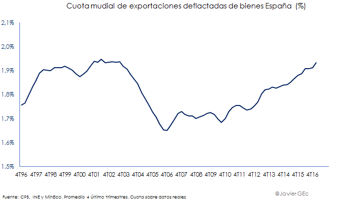 Sin embargo, si el objetivo es medir la evolución relativa de las exportaciones entre países, la referencia a seguir es la cuota de exportaciones reales o deflactadas que aísla, por ejemplo, el impacto de la variación del precio del petróleo en el total de exportaciones mundiales. Además, son las exportaciones deflactadas las que impactan en el PIB real de la economía. En este caso, la tendencia es de clara mejora y se sitúa en 2017 cerca del 2%.