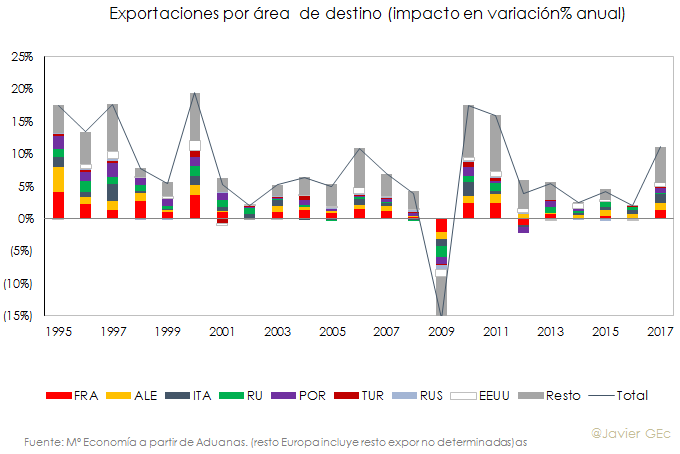 En cuanto a los mercados destino, la eurozona explica algo más de la mitad del crecimiento del año e incrementa su cuota en el total exportaciones. En el resto de áreas su contribución al crecimiento es similar a su cuota, salvo en el caso de África, que ha perdido peso como destino.