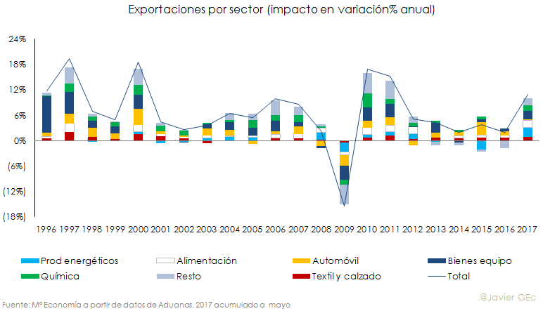 Uno de los aspectos más significativos en este año es que el repunte se ha producido en ausencia de crecimiento en las exportaciones de automóviles, el auténtico motor exterior en los cuatro últimos años. En 2017, las exportaciones de los sectores de bienes de equipo, especialmente aeronaves a Alemania y motores a Francia; alimentación, sobre todo aceites y frutas y hortalizas a Italia; o productos energéticos, donde destacan las de petróleo y derivados a Gibraltar, han tomado el relevo al automóvil.