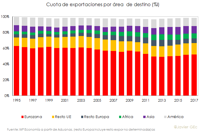 Por tanto, la eurozona, en su conjunto es el principal destino de las exportaciones con una cuota del 52% del total, que se ha incrementado desde el 50% de 2013, algo lógico teniendo en cuenta que se comparte divisa.