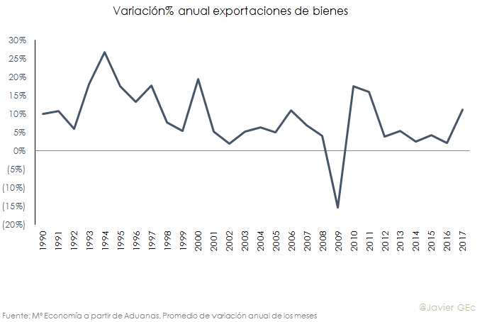 Las exportaciones españolas de mercancías crecen en 2017 y alcanzan cifras récord de seis años. Hasta el mes de mayo, el crecimiento anual promedio superó el doble dígito por primera vez desde 2011, con una tasa del +11%, muy por encima del 2%-5% registrado en cualquiera de los tres años anteriores.