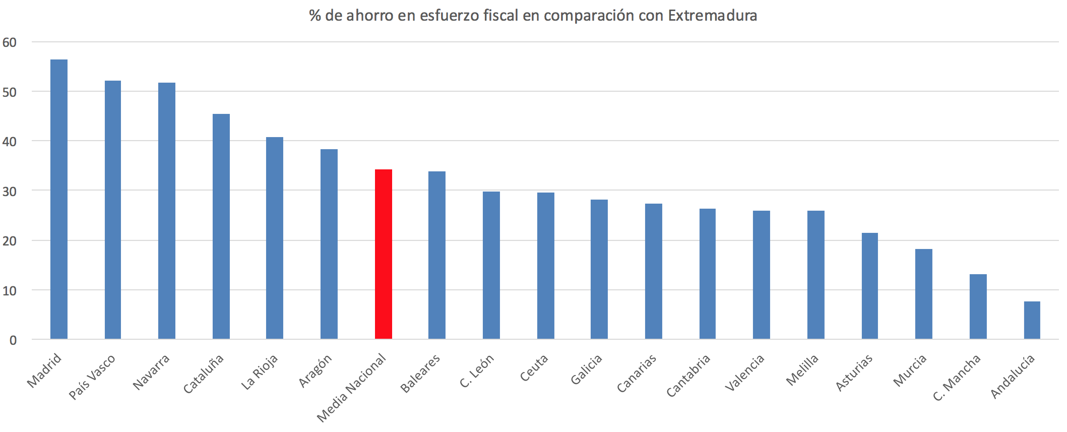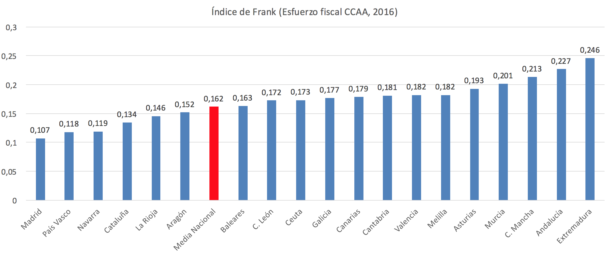 El Índice de Frank para Madrid es inferior en 56 puntos porcentuales al observado en Extremadura. De hecho, si comparamos la región gobernada por Guillermo Fernández Vara con el territorio vecino de Castilla y León (con el que comparte características como la dispersión de población o el envejecimiento) vemos que el esfuerzo fiscal es un 30% más bajo en la autonomía que gobierna Juan Vicente Herrera.