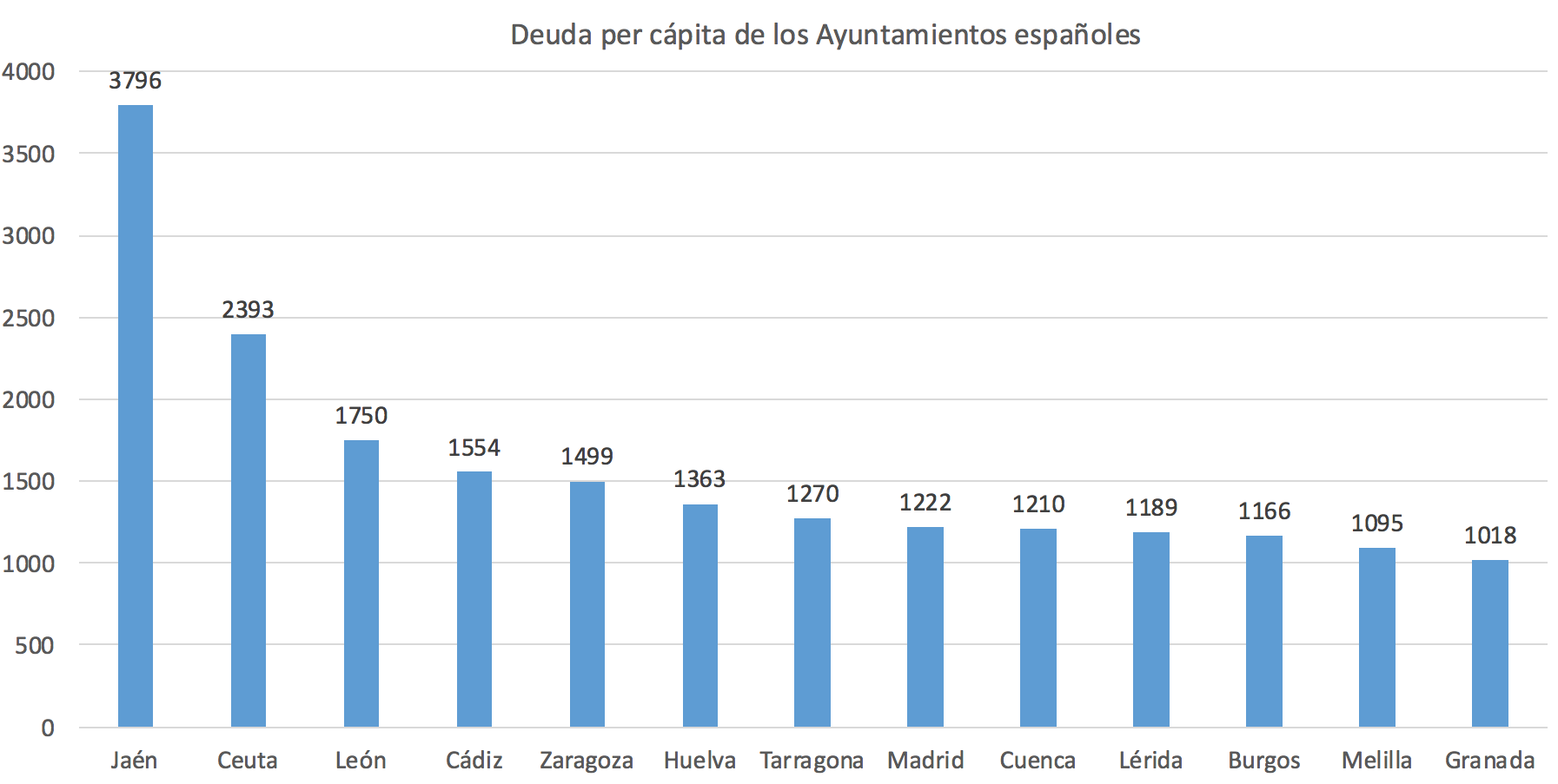 Si tomamos como referencia las capitales de provincia, vemos que Jaén está en cabeza, con una deuda por residente de 3.796 euros. Más bajas son las obligaciones de Ceuta (2.393 euros), León (1.750 euros), Cádiz (1.554 euros) y Zaragoza (1.499 euros), que completan el top cinco del endeudamiento municipal per cápita.