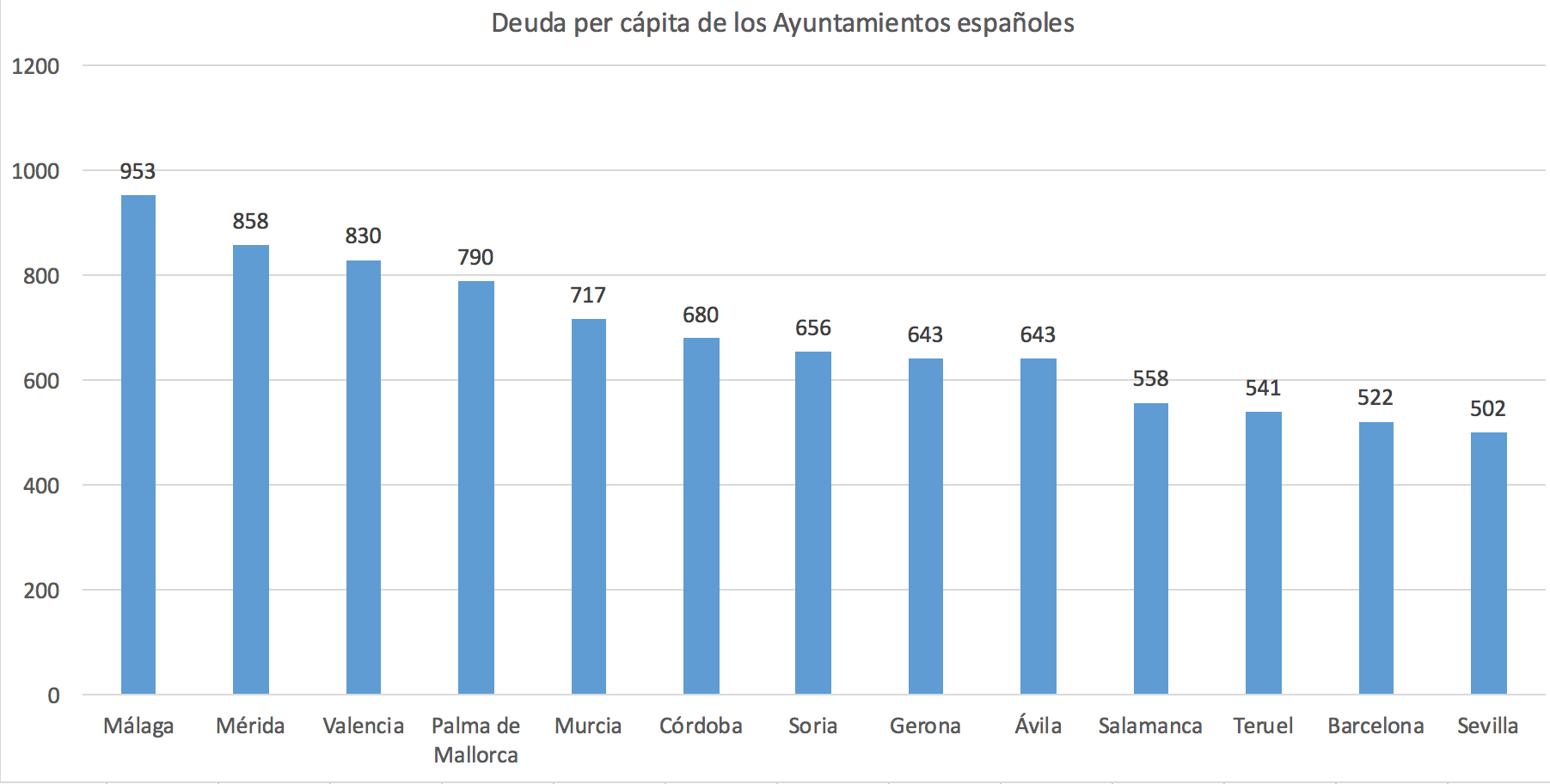 La deuda local per cápita se mueve entre 500 y 1.000 euros en Málaga (953 euros), Mérida (858 euros), Valencia (830 euros), Palma de Mallorca (790 euros), Murcia (717 euros), Córdoba (680 euros), Soria (656 euros), Gerona (643 euros), Ávila (643 euros), Salamanca (558 euros), Teruel (541 euros), Barcelona (522 euros) y Sevilla (502 euros).