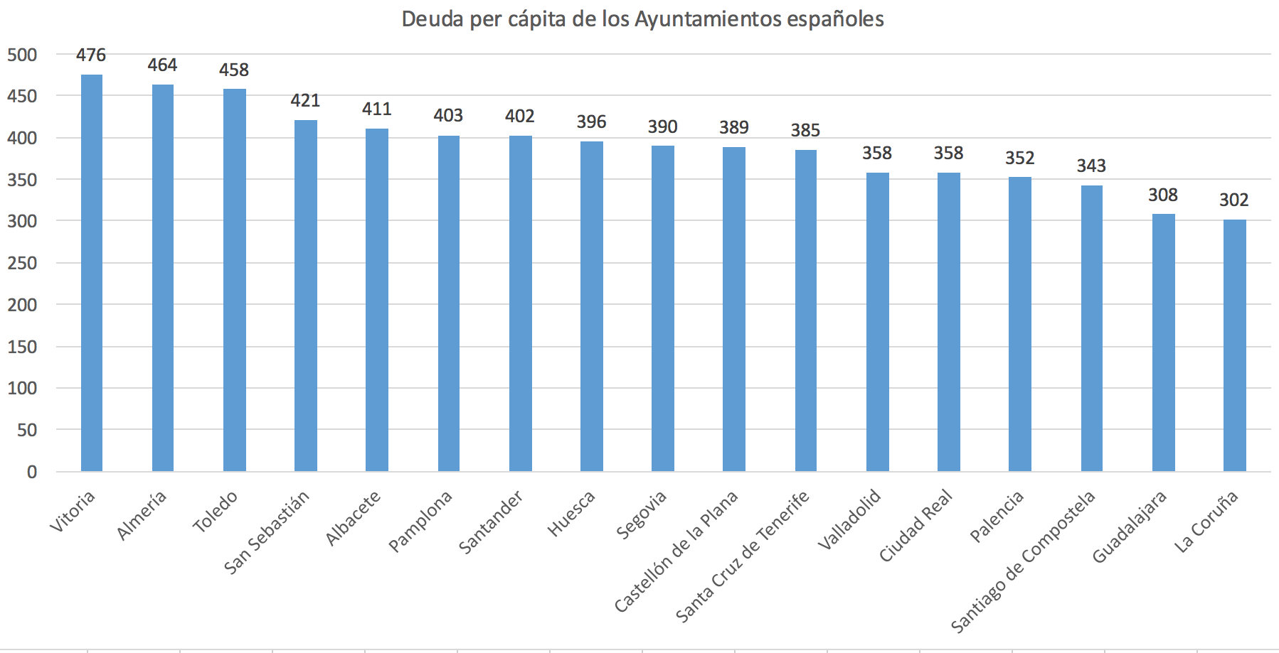 Algo más bajo es el endeudamiento por habitante de las capitales que se mueven entre 300 y 500 euros: Vitoria (476 euros), Almería (464 euros), Toledo (458 euros), San Sebastián (421 euros), Alicante (411 euros), Pamplona (403 euros), Santander (402 euros), Huesca (396 euros), Segovia (390 euros), Castellón (389 euros), Tenerife (385 euros), Valladolid (358 euros), Ciudad Real (358 euros), Palencia (352 euros), Santiago de Compostela (343 euros), Guadalajara (308 euros) y La Coruña (302 euros).
