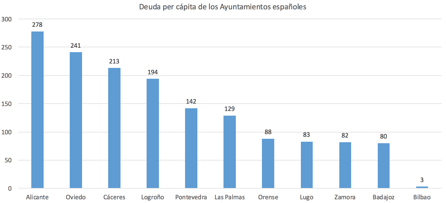 Finalmente, los niveles más bajos (inferiores a 300 euros), apuntan a un pasivo por habitante de 278 euros en Alicante, 241 en Oviedo, 213 en Cáceres, 194 en Logroño, 142 en Pontevedra, 129 en Las Palmas, 88 en Orense, 83 en Lugo, 82 en Zamora, 80 en Badajoz y 3 en Bilbao.