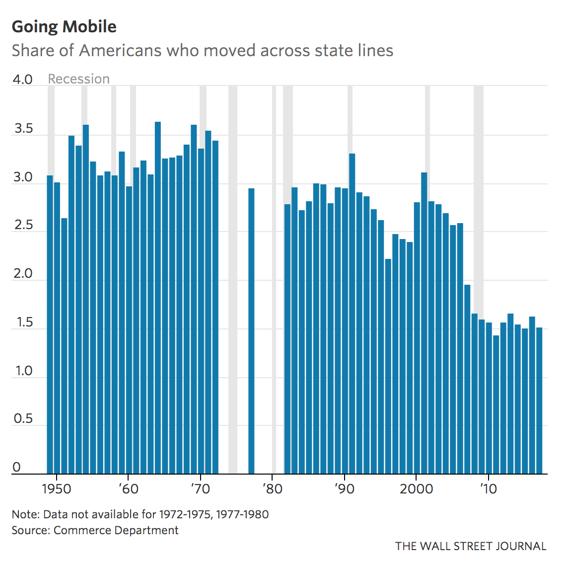 "Antaño, entre el 3 y el 3,5 por ciento de la población estadounidense se trasladaba anualmente de un territorio a otro, buscando nuevas oportunidades profesionales y personales. Eso enriquecía nuestro modelo económico y nuestro tejido social. Pero esos niveles de movilidad han quedado atrás. En los 90 pasan a moverse entre el 2,5 y el 3 por ciento. Tras el estallido de la crisis, se desploman hasta el 1,5 por ciento", apunta.