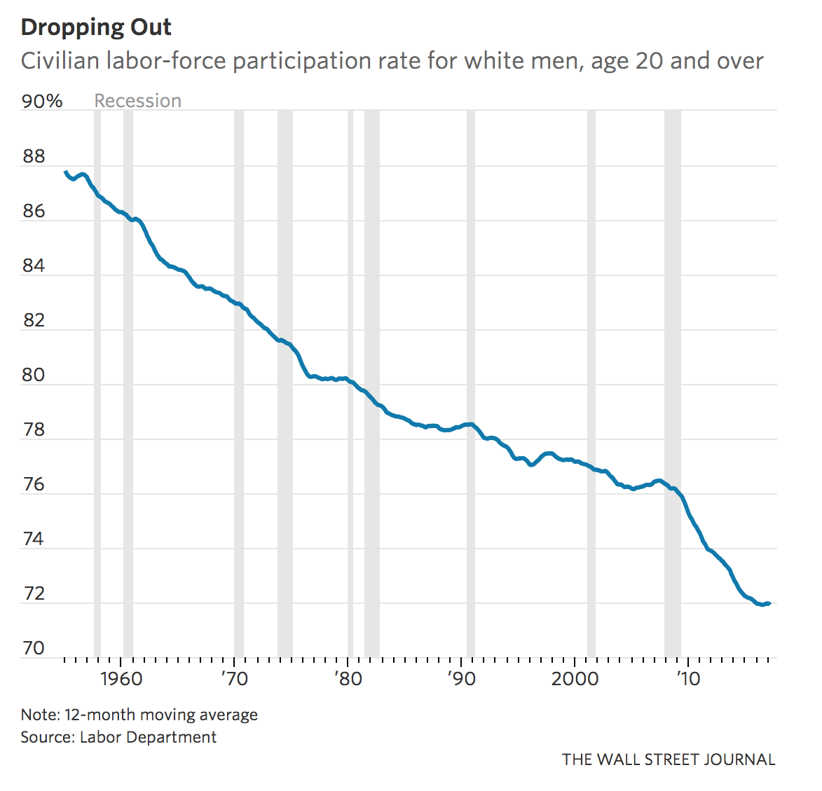 Uno de los indicadores que más preocupa a Cowen es la tasa de participación laboral. "No hace falta irte al caso de las minorías. Toma el caso de los hombres blancos de más de veinte años. En los años 50, el 88 por ciento estaba participando en el mercado de trabajo. Hoy, esa tasa ha caído al 72 por ciento".