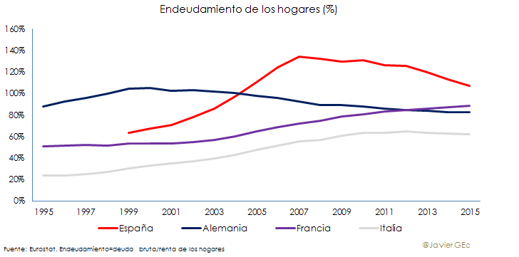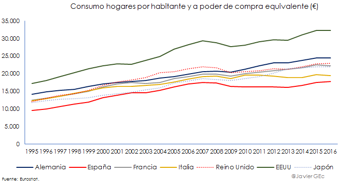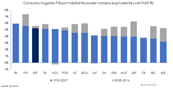 El problema es que gran parte de dicho crecimiento se produjo a base de un mayor endeudamiento y, por ello, aquellos años de crecimiento finalizaron con el estallido de la burbuja inmobiliaria. Desde entonces, y ha pasado prácticamente una década, el consumo en España se ha estancado. Consecuencia del estancamiento, en 2016 el nivel de vida del hogar español había retrocedido en términos relativos, situándose en el 73% del alemán y en el 80% del francés, retrocediendo así más de la mitad del camino recorrido hacia la convergencia con Europa.