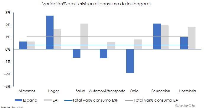 Pero la realidad es peor de lo que indican estas cifras. El detalle por tipo de consumo ofrece una imagen aún más negativa para la familia española. Entre las principales categorías del consumo -que suman el 80% del consumo total-, el gasto de las familias españolas sólo ha crecido más en el hogar -en la educación la evolución ha sido muy similar +2,1% en España vs +1,9% en la zona euro-, mientras que el dedicado a ocio, salud o automóvil ha descendido frente al crecimiento promedio registrado en la zona euro.
