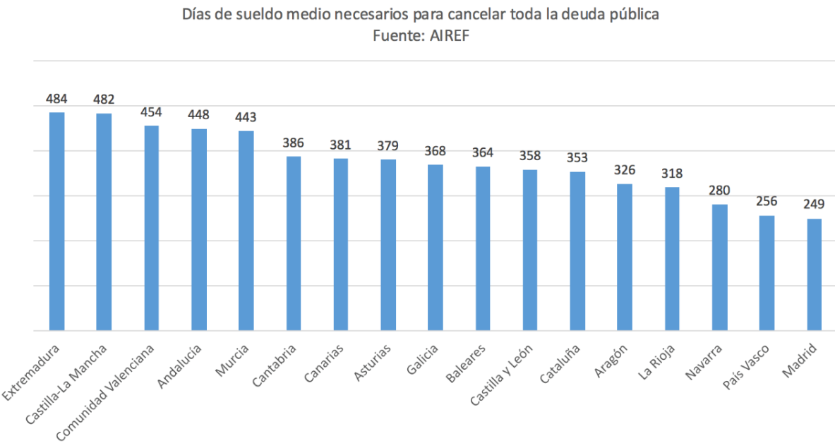 Además de Extremadura, las cifras más altas las encontramos en Castilla-La Mancha (482 días de sueldo), Comunidad Valenciana (454), Andalucía (448) o Murcia (443). A cierta distancia aparece un segundo grupo, en el que entran Cantabria (386 días de sueldo), Canarias (381), Asturias (379), Galicia (368), Baleares (364), Castilla y León (358), Cataluña (353), Aragón (326) y La Rioja (318).