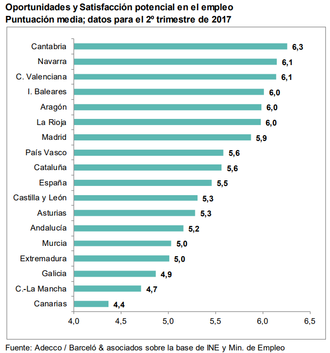 Cantabria, Navarra y la Comunidad Valenciana son las mejores comunidades autónomas para trabajar, según el Monitor Adecco de Oportunidades y Satisfacción en el Empleo, que profundiza en el grado de satisfacción y en las oportunidades del mercado laboral.
