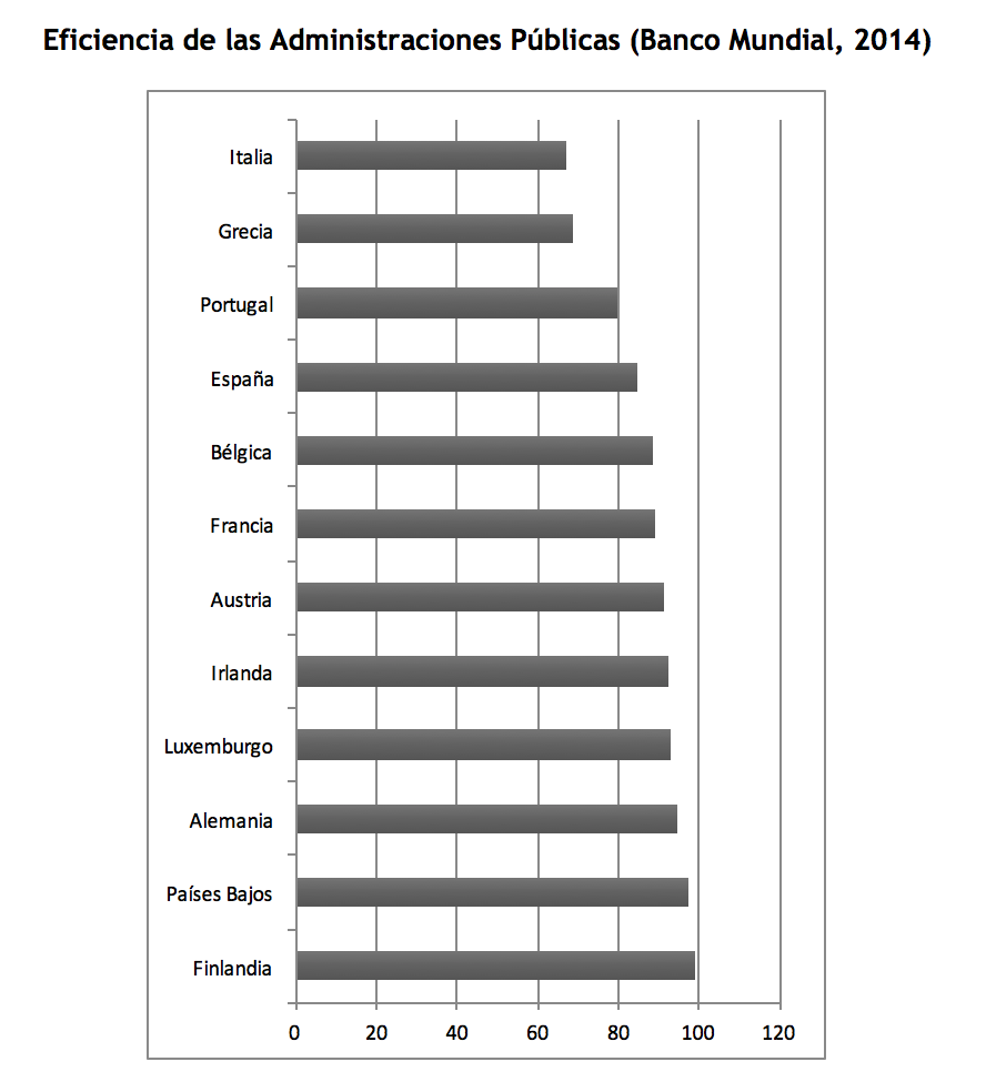 Algo similar apuntan los técnicos del Banco Mundial. Según sus indicadores de medición de la calidad institucional, el de España es uno de los sectores públicos menos eficientes de todos los países fundadores de la Eurozona. Solo Italia, Grecia y Portugal obtienen una peor nota.