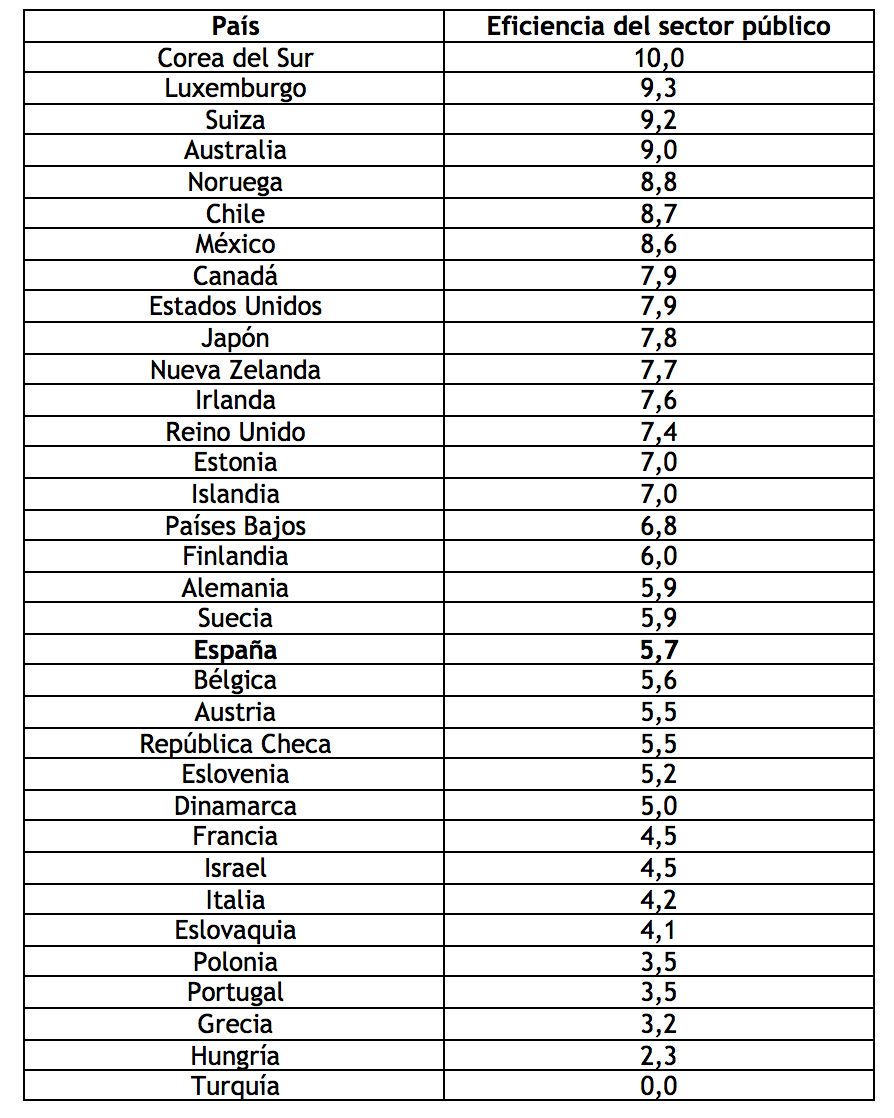 España se coloca en la zona media-baja de la tabla, con una puntuación de 5,7 sobre 10 que contrasta con el gran resultado que cosechan los sectores públicos de Corea del Sur, Luxemburgo, Suiza, Australia, Noruega, Chile, México, Canadá, Estados Unidos o Japón, que se mueven en notas superiores a 7,8 puntos.